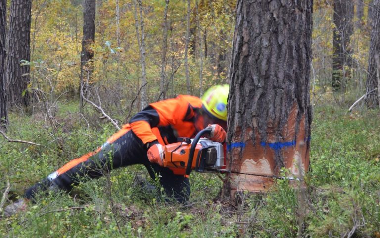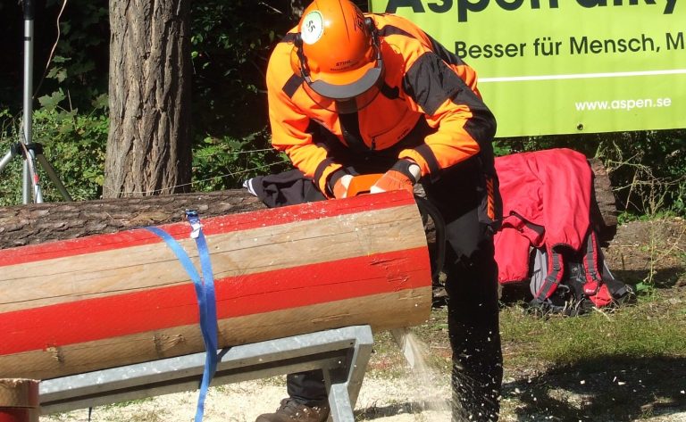 Ein Baum mit einem Brusthöhendurchmesser von 32 bis 38cm wird in Richtung eines Zielpfahls in 15m Entfernung gefällt.