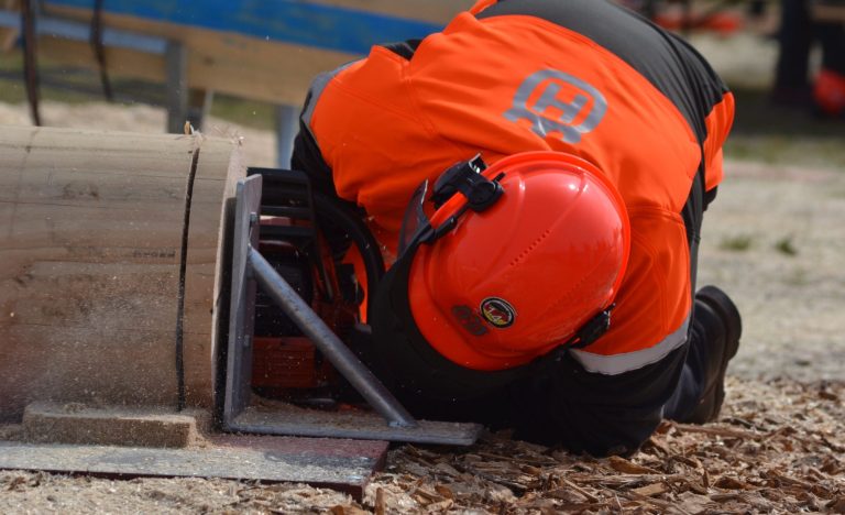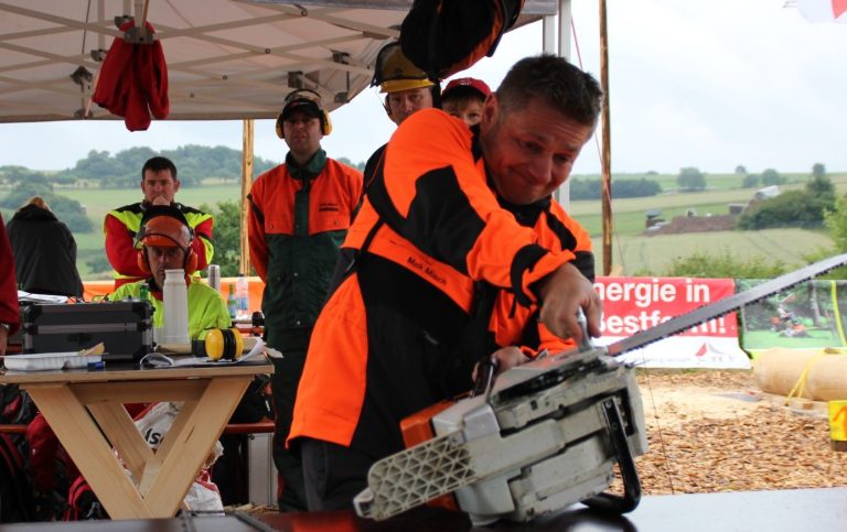 An der Motorsäge wird möglichst schnell die Kette gewechselt und dabei die Schiene gewendet.